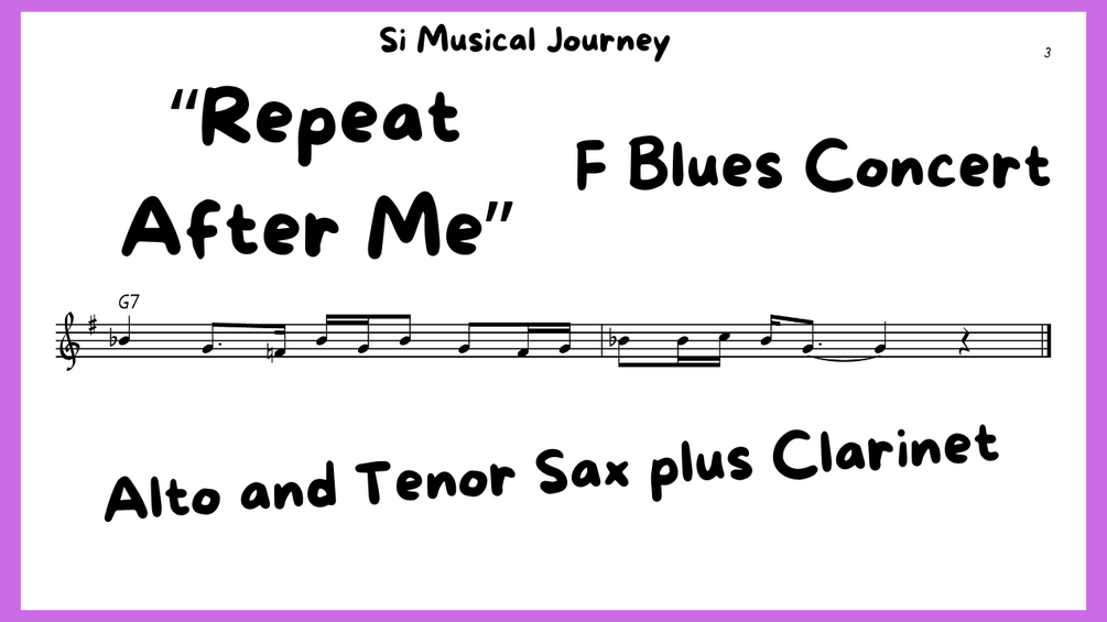 This download provides the FREE pdf notation for the first chorus of the F Concert Blues progression. This is the essential music needed to play along with the beginning of the popular YouTube "Repeat After Me" Challenge series.